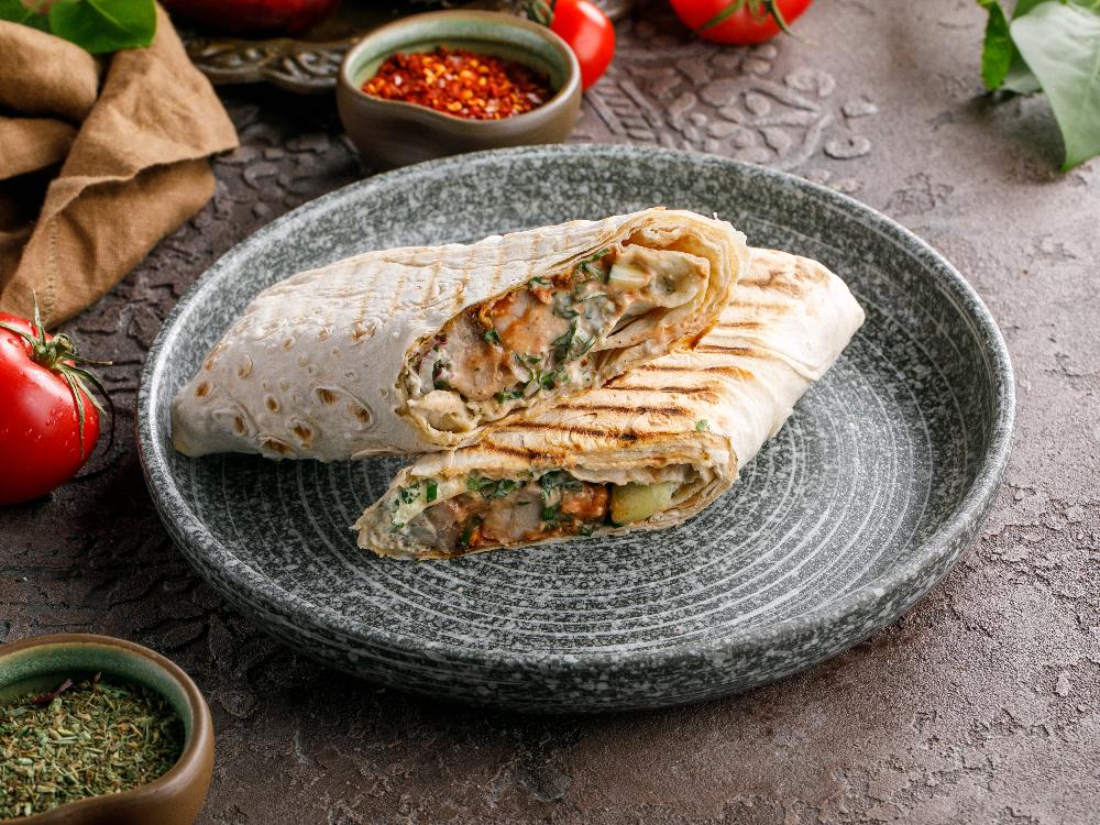 Нежный куриный шашлык со свежими огурцами, помидорами, красным луком и миксом свежей зелени в хрустящем лаваше, поджаренном на гриле.