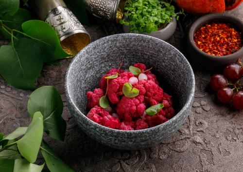 Хрустящая цветная капуста, маринованная по гурийскому рецепту со свёклой и острым красным перцем.