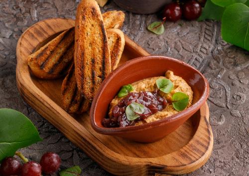Деликатесный паштет из утки, приготовленный с добавлением сливок и грузинских специй. Подаётся с луковым мармеладом, томлёном в красном вине.