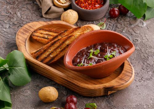 Карамелизированный лук, приготовленный на вине с грузинскими специями. Закуска идеально подходит к мясу и вину.