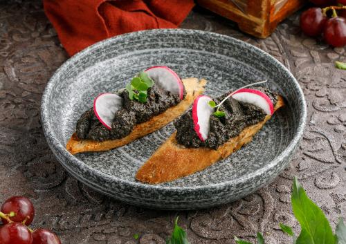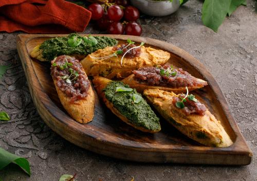 Ассорти авторских брускет с грузинским акцентом - 2 брускетты с утиным паштетом 2 брускетты с грузинским песто, 2 брускетты с луковым мармеладом.