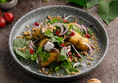 Баклажаны с двумя видами традиционных начинок: грецкие орехи с чесноком и грузинскими специями, сыр надуги с мятой.