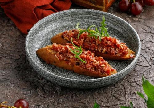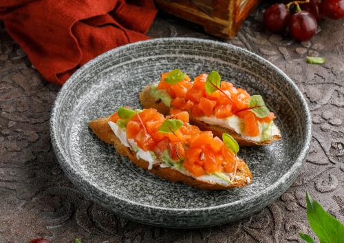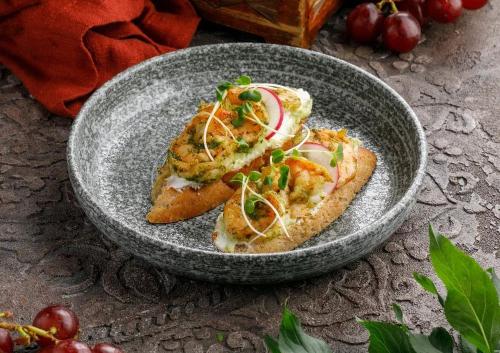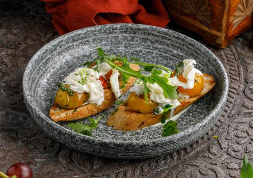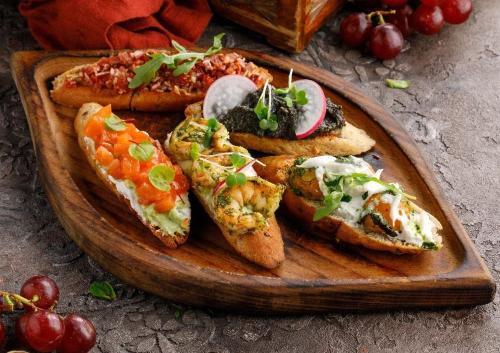Ассорти авторских батумских брускетт с грузинским акцентом: томаты черри и страчателла, оливовый топенад, пармская ветчина с вялеными томатами, креветка с авокадо и творожным сыром, лосось и авокадо и с творожным сыром.