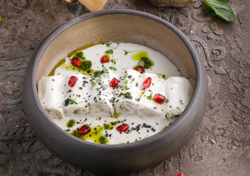 Рулетики из сыра сулугуни с начинкой из творожного сыра и рубленной мяты в соусе мацони.