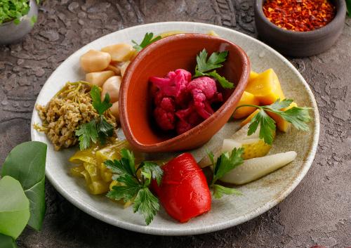 Ассорти традиционных домашних грузинских солений: зелёные помидоры, перец чили, солёный чеснок, цветная капуста по-гурийски, маринованные патиссоны и болгарский перец, каперсы.