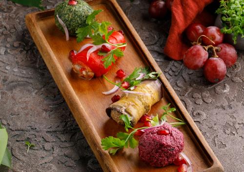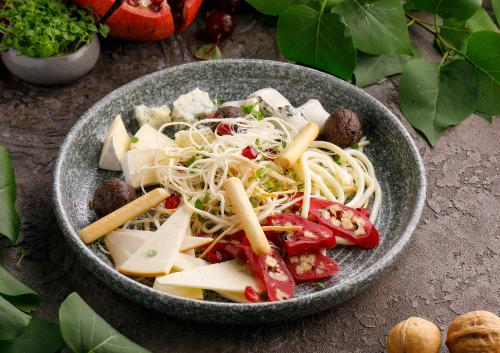 Ассорти сыров: классические копчёные сыры сулугуни и чечил, молочный сыр чечил, рулетики из сулугуни с творожным сыром и мятой, а также сыр бри и дорблю. Сет дополняют зёрна граната, чурчхела и конфеты из сухофруктов.