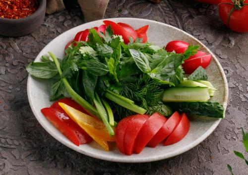 Ассорти из свежих овощей и ароматной зелени станет прекрасным дополнением к любому застолью.