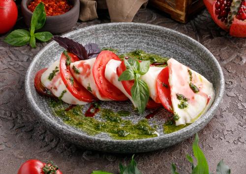 Тонкие блинчики сулугуни чередующиеся со свежими сочными томатами и ароматным базиликом с добавлением соуса наршараб и песто.