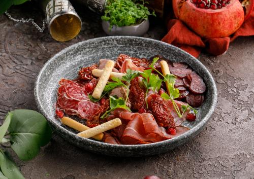 Мясная закуска из нескольких видов грузинских деликатесов, приготовленных по традиционным рецептам – бастурма в пряных специях, суджук, шейка коппа, колбаса фуэт, утиная грудка и вяленые томаты.