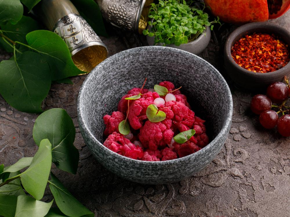 Хрустящая цветная капуста, маринованная по гурийскому рецепту со свёклой и острым красным перцем.
