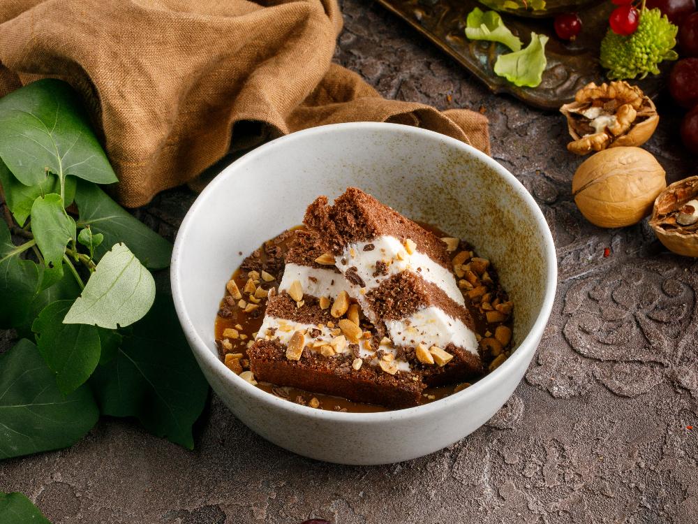 Шоколадный бисквит с арахисом, солёной карамелью и нежным сливочным кремом.