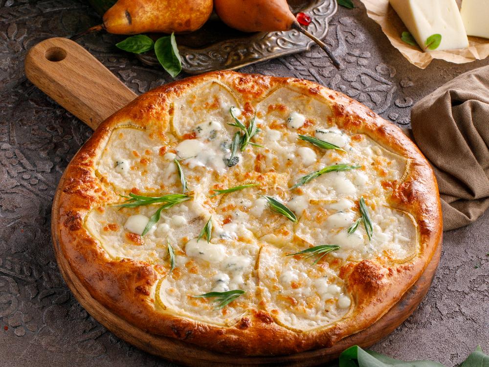 Хачапури, сочетающий сладость груши и пикантность сыров сулугуни и дорблю.
