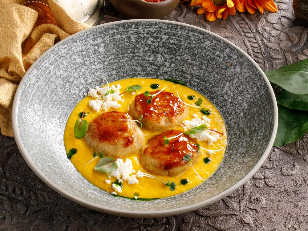 Котлетки из щуки, глазированные в устричном соусе, подаются с муссом из тыквы и «снегом» из сыра фета.