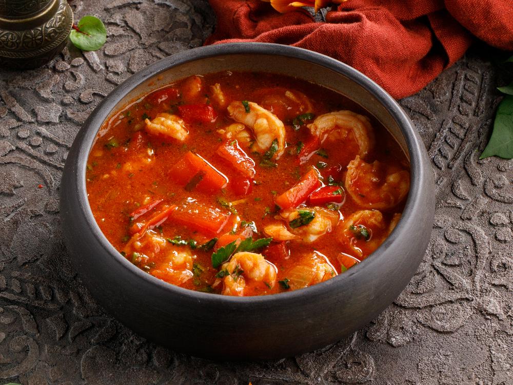 Золотистые креветки, томлёные в кисло-сладком соусе из болгарского перца, томатов, чеснока, репчатого лука и неповторимого микса грузинских специй.