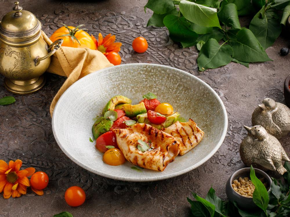 Ароматный кальмар на гриле с авокадо и подкопчёнными томатами.