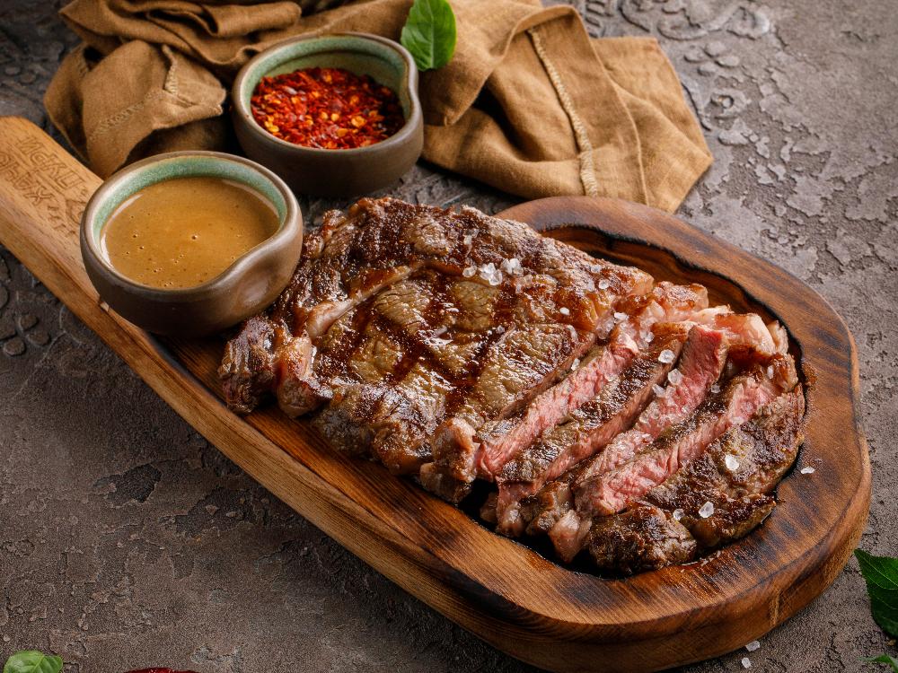 Премиальный стейк из мраморной говядины зернового откорма, замаринованный в аджике со сванской солью, подаётся с перечным соусом.