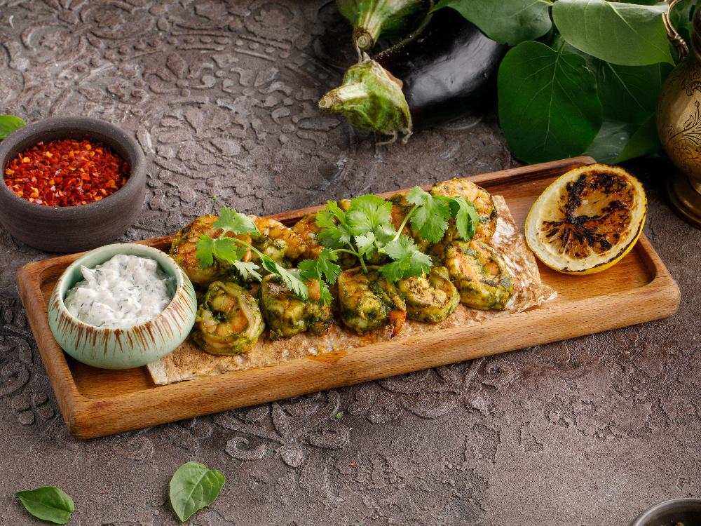 Креветки, маринованные в соусе песто с чесноком и сванской солью. Подаются с соусом тартар.