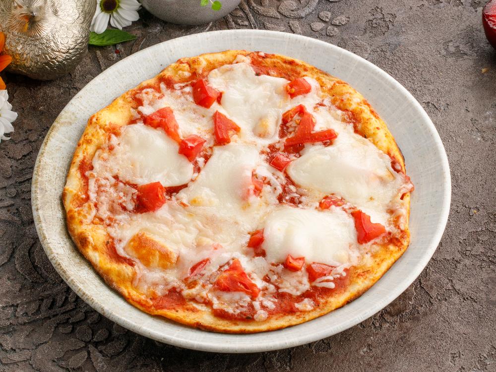 Тесто (мука, яйцо, соль, маргарин, молоко, сахар, дрожжи), сыр сулугуни, сыр имеретинский, соус томатный (томаты в собственном соку, прованские травы, чеснок, соевый соус), помидоры.