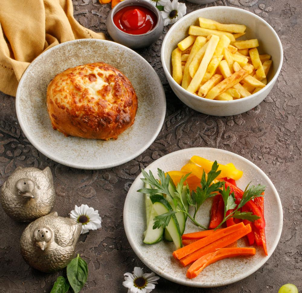 Овощные палочки, Картофель Фри, Детский хачапургер, кетчуп.
