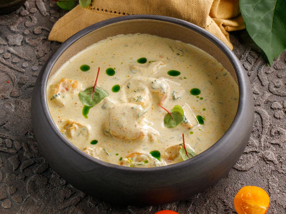 Описание:Состав: креветки, сливки, чеснок, кинза, петрушка, сванская соль, шафран имеретинский, масло растительное, микрозелень.