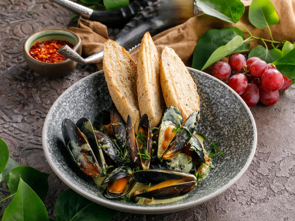 Мидии в грузинском соусе на основе ркацители и сливок с добавлением тархуна, подаются с хрустящим зерновым багетом.