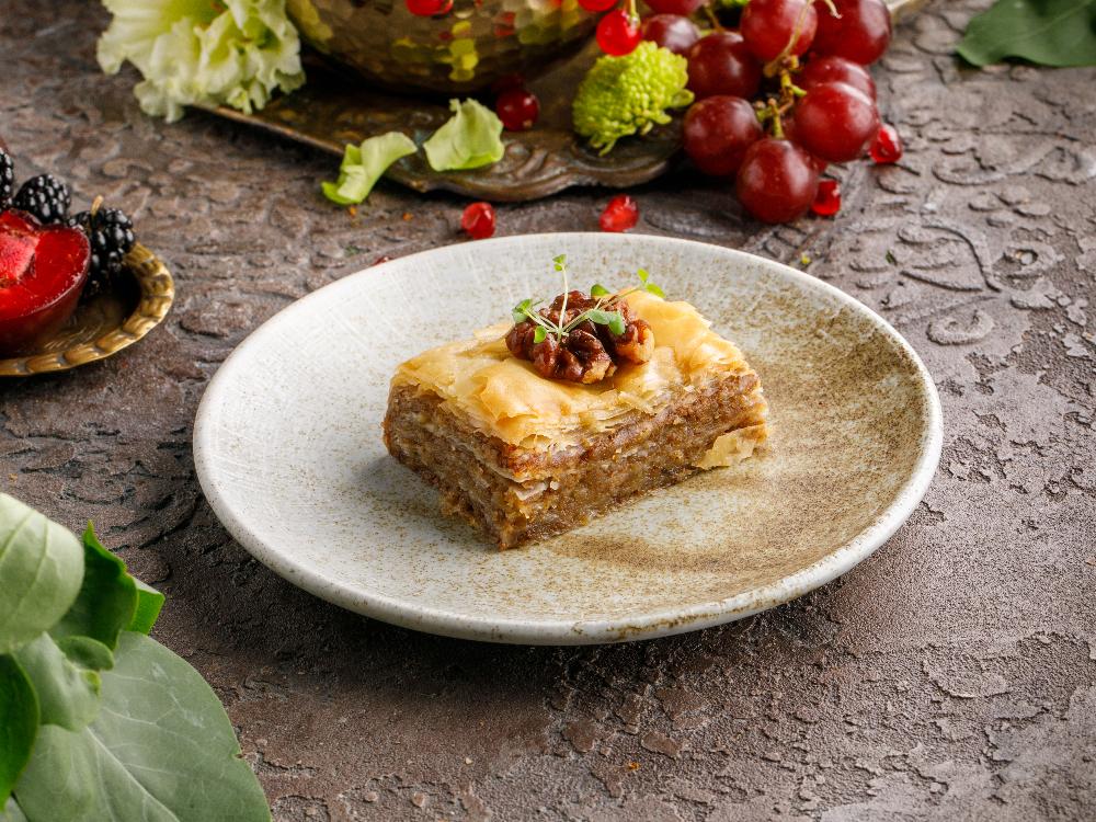 Хрустящая пахлава с грецким орехом, пропитанная медовым сиропом.