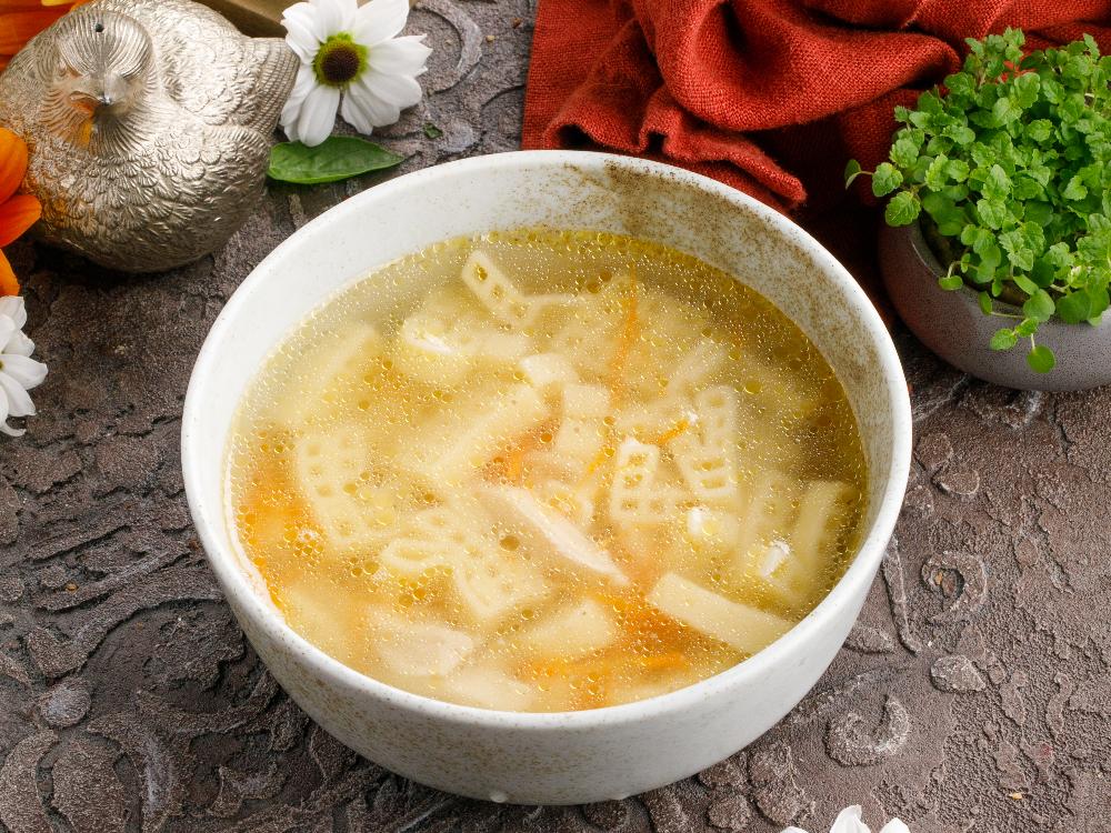 Куриный бульон, морковь, макароны Алфавит, куриная мякоть, соль.