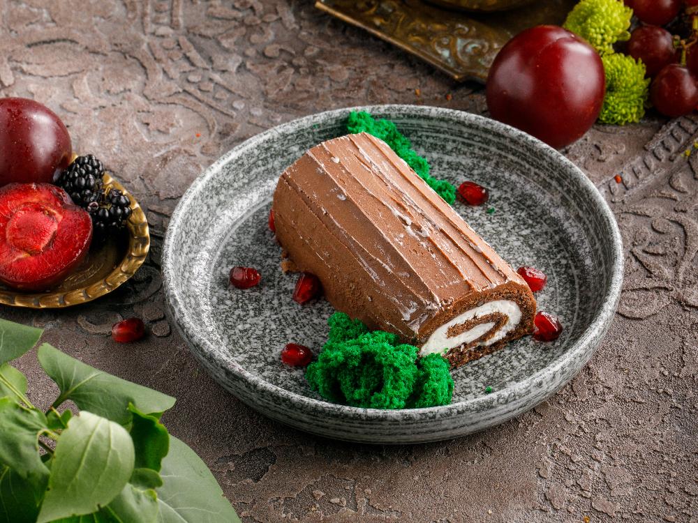 Шоколадно-ореховый рулет со сливочным кремом, мармеладом из сливы и ганашом из тёмного шоколада.