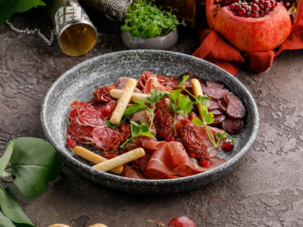 Мясная закуска из нескольких видов грузинских деликатесов, приготовленных по традиционным рецептам – бастурма в пряных специях, суджук, шейка коппа, колбаса фуэт, утиная грудка и вяленые томаты.