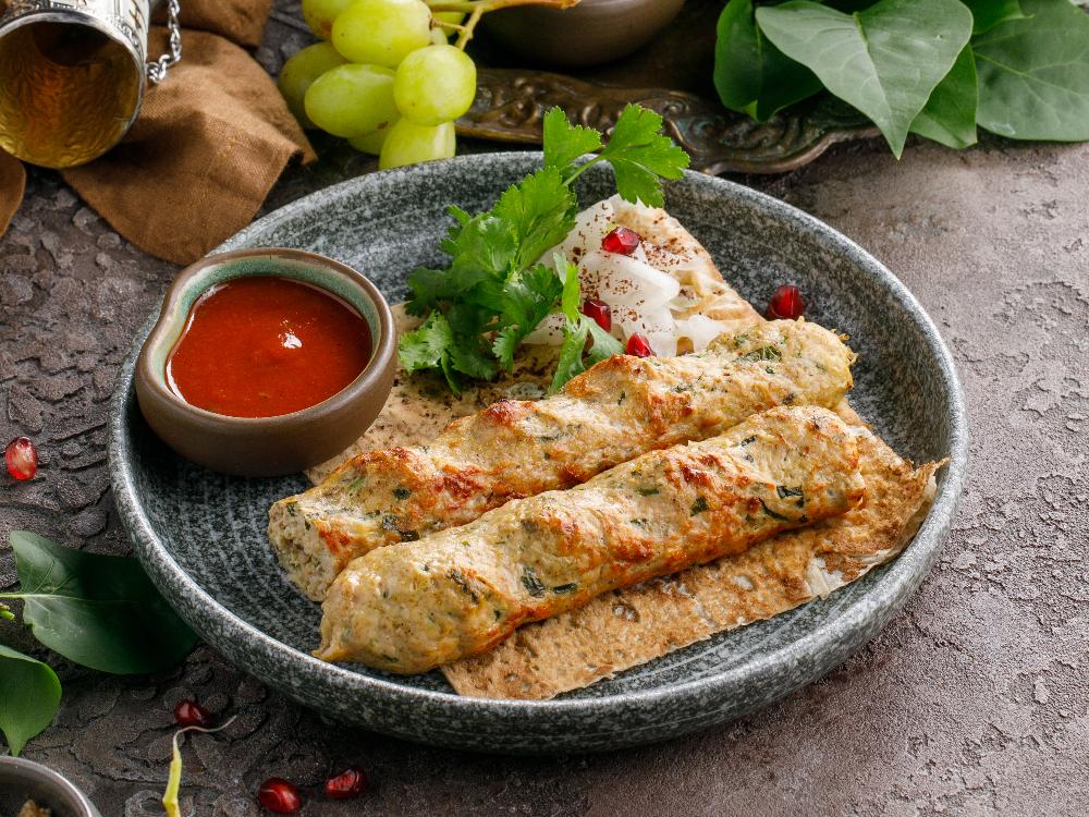 Блюдо из сочного фарша с грузинскими ароматными специями и репчатым луком. Подаётся на лаваше с маринованным луком и соусом сацебели.