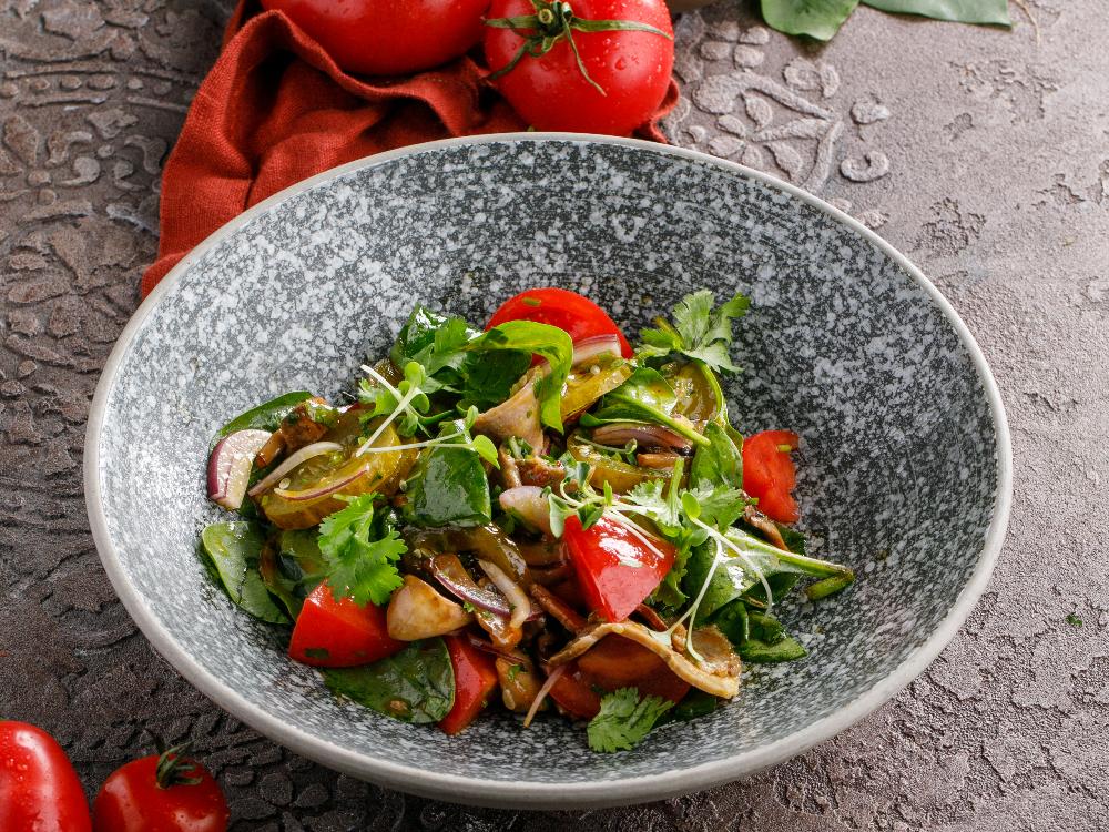 По рецепту дедушки Мамуки! Говяжий язык с шампиньонами, помидорами, солёными огурцами и зеленью.