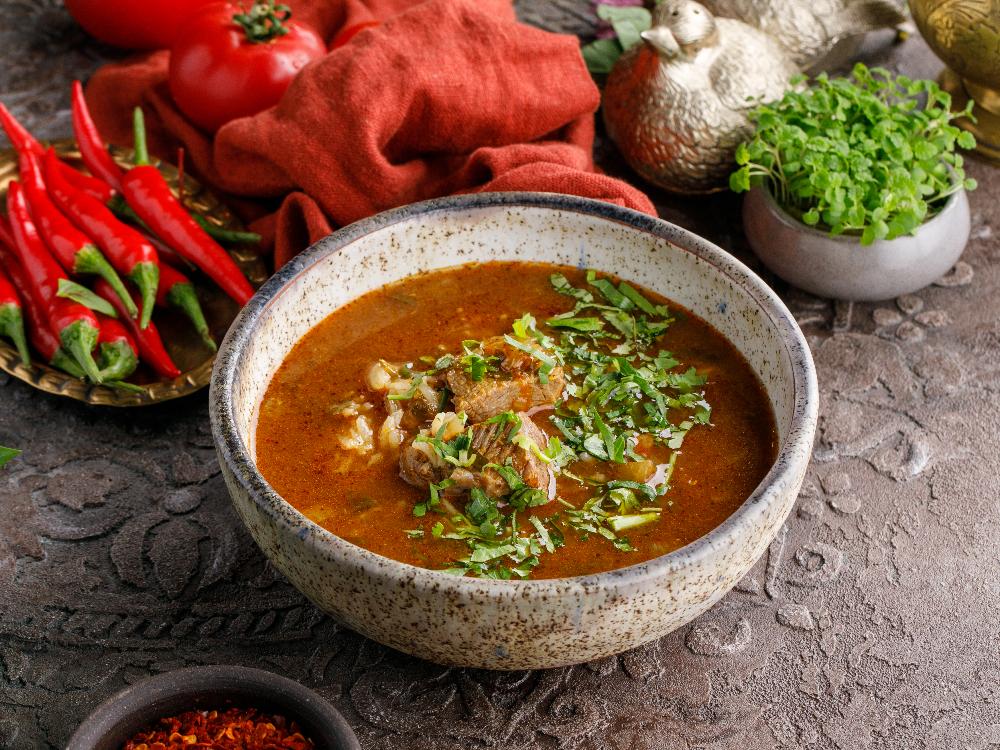 Легендарный суп из говядины с рисом, луком, томатами, зеленью и грузинскими специями.