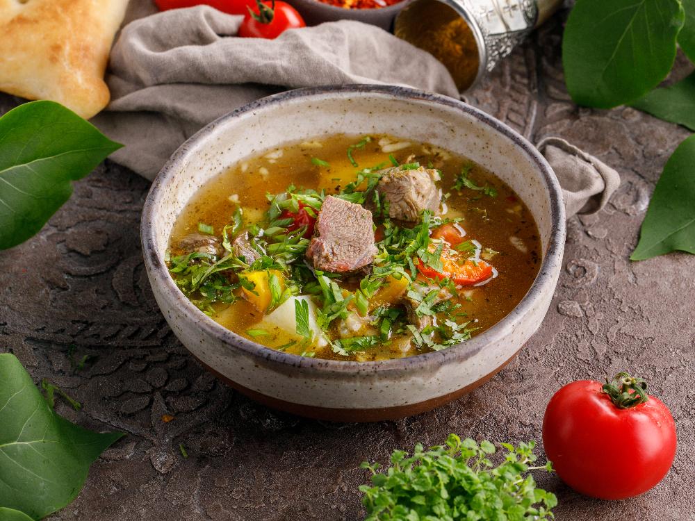 Наваристый суп из томлёной баранины, картофеля, болгарского перца, помидоров, грузинских специй и зелени.