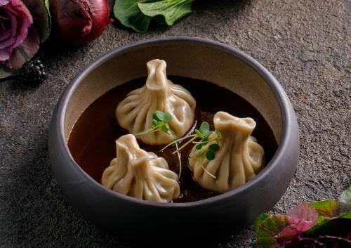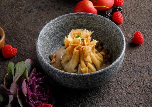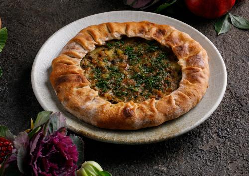 Пирог из тонких хрустящих слоев теста с пряной начинкой из сливы. Подаётся с соусом на основе растительного молока.