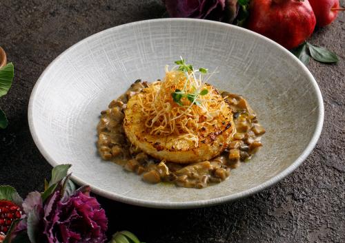 Ароматный стейк из корня сельдерея с чесноком конфи. Подаётся с соусом из лесных грибов и овсяного молока.
