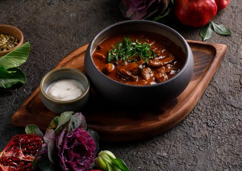 Густая насыщенная грибная солянка с оливками и каперсами. Подаётся с постной сметаной.
