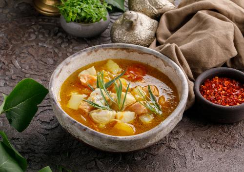 Наваристый суп из томлёной баранины, картофеля, болгарского перца, помидоров, грузинских специй и зелени.