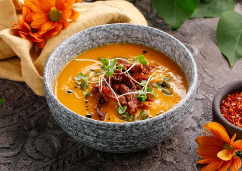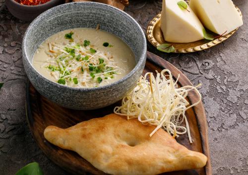 Авторский сырный суп с сыром чечил, копчёным сулугуни и ароматным шафраном.