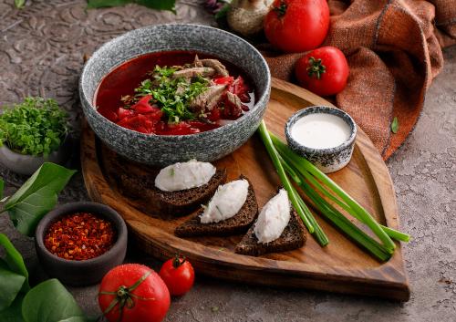Классический борщ с говядиной, подаётся с салом на чёрном хлебе и зелёным луком.