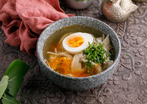 Куриный бульон с домашней лапшой, морковью, зеленью и яйцом.