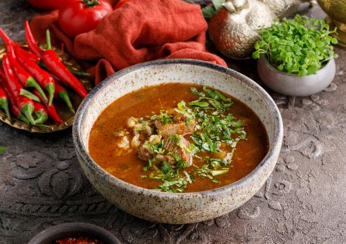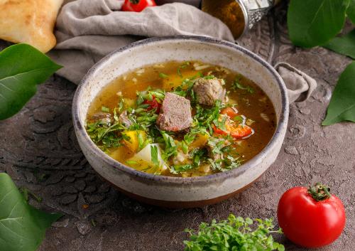 Легендарный суп из говядины с рисом, луком, томатами, зеленью и грузинскими специями.
