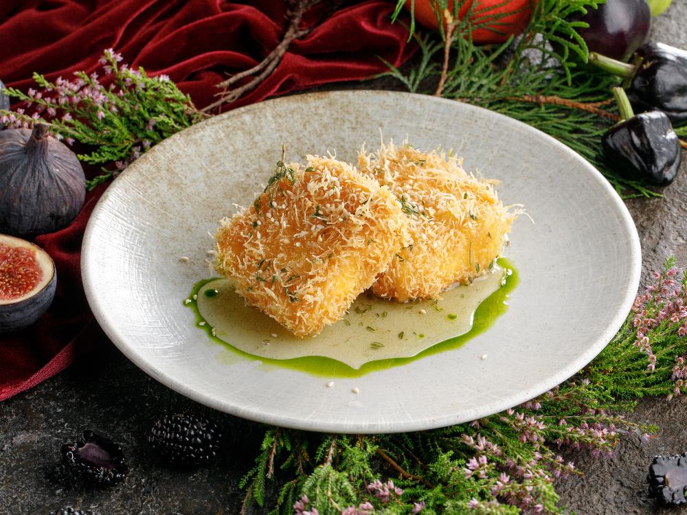 Горячая закуска из сыра фета в хрустящей панировке в сочетании с тимьяновым медом.
