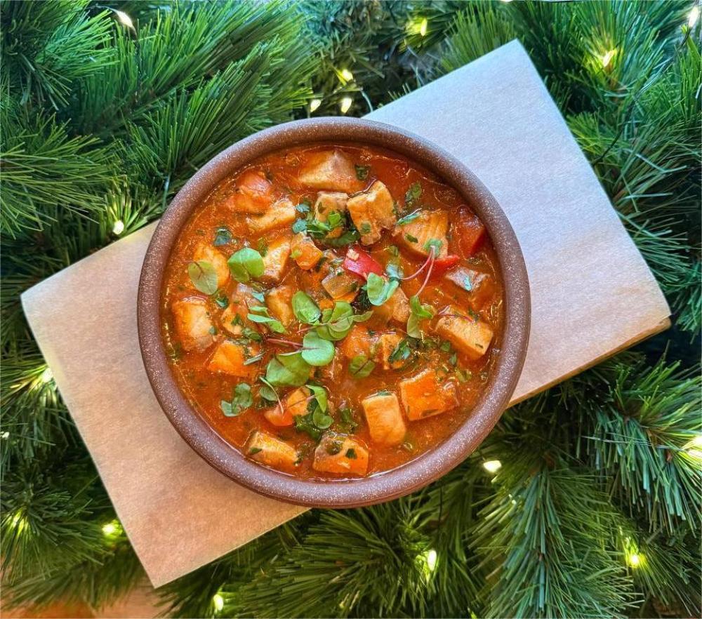 Рагу из овощей с обжаренными до золотистой корочки осетром.