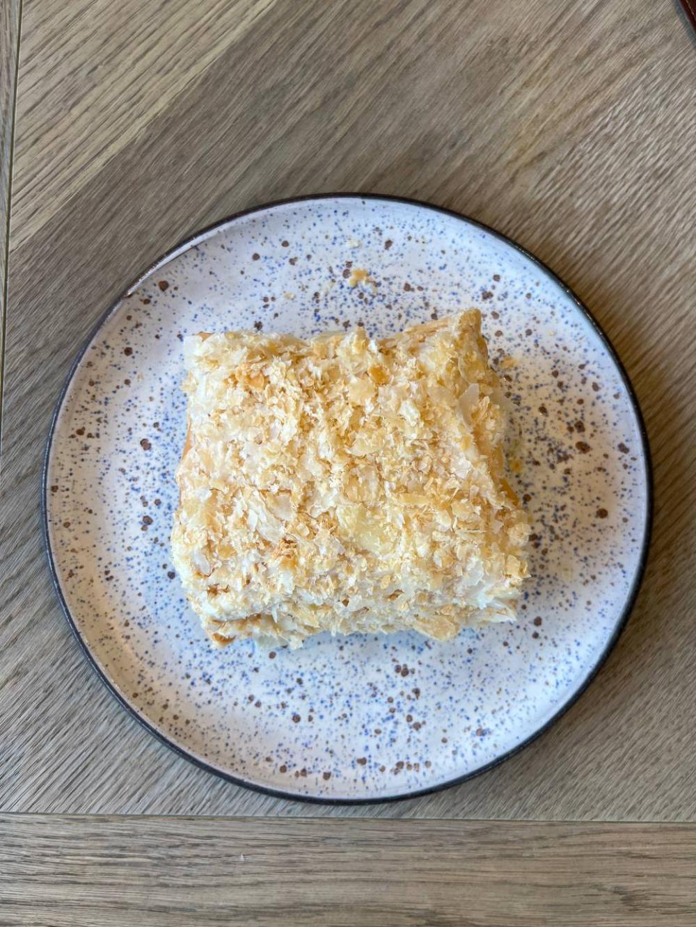 Казалось бы, наполеон - классический десерт, который сложно изменить. Но в нашей вариации крем для него сделан на основе овсяного молока, что делает текстуру торта такой же нежной, как в классическом варианте, но подходящей для людей с непереносимостью лактозы и вегетерианцев. Сливочный вкус наполеона дополняется кизиловым соусом.
