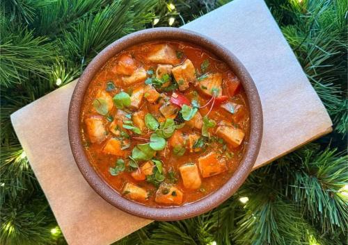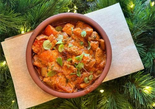 Осетр, тушёный в томатном соусе с луком, болгарским перцем, грузинскими специями и зеленью.