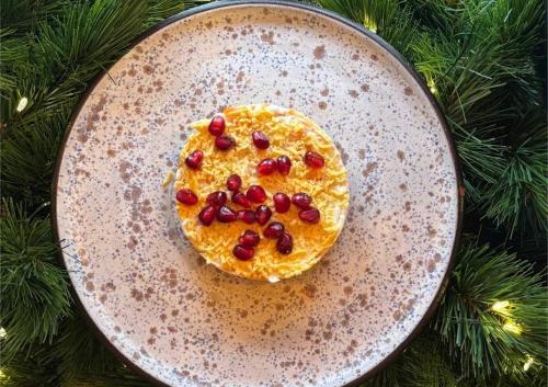 Слоеный салат из запеченных овощей и семги. ( Семга, картофель, яйцо, морковь, майонез)